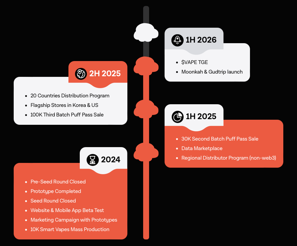 • 2024 – Infrastructure & Prep: seed funding, smart vape prototypes, app beta, initial device series