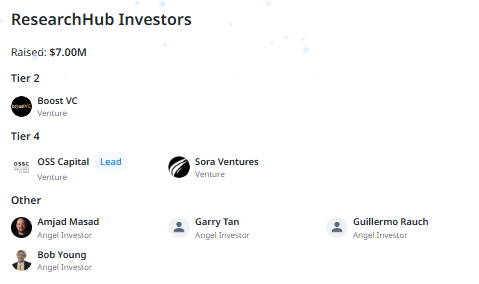 ResearchHub has raised a total of $7 million in funding, creating a strong financial backing structure. The investor profile combines early-stage technology funds with angel investors who are leading entrepreneurs in the sector.
