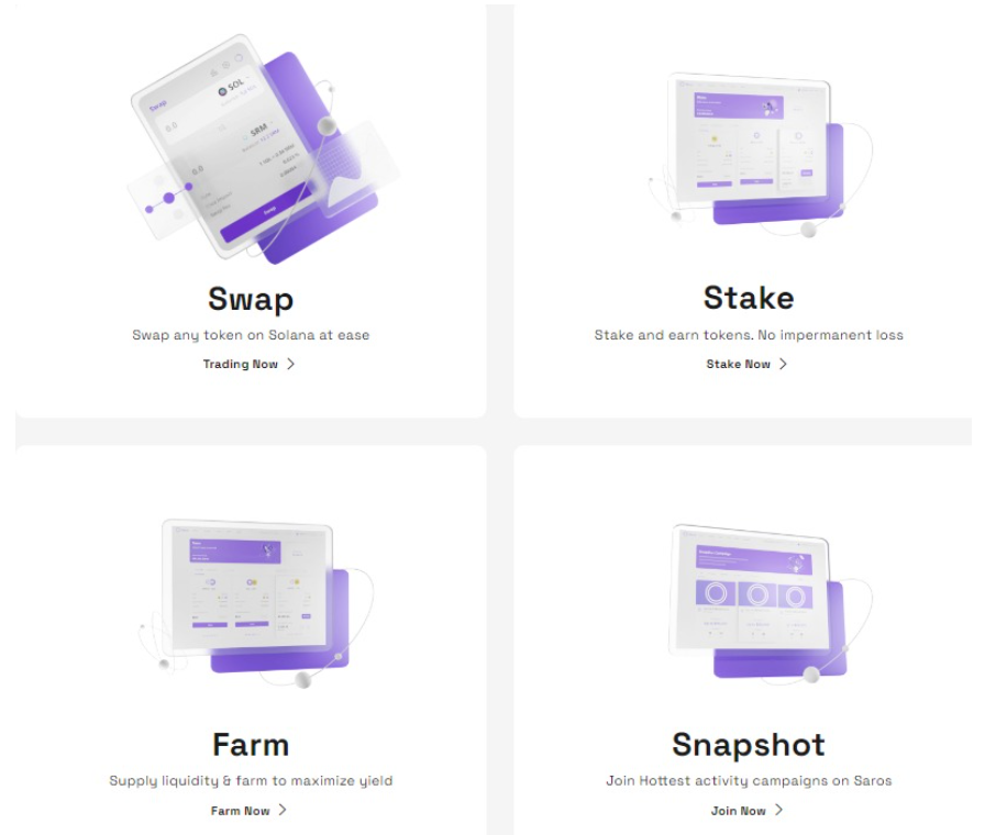 - SarosSwap (AMM DEX): Decentralized swapping of SPL tokens, with passive liquidity provision.