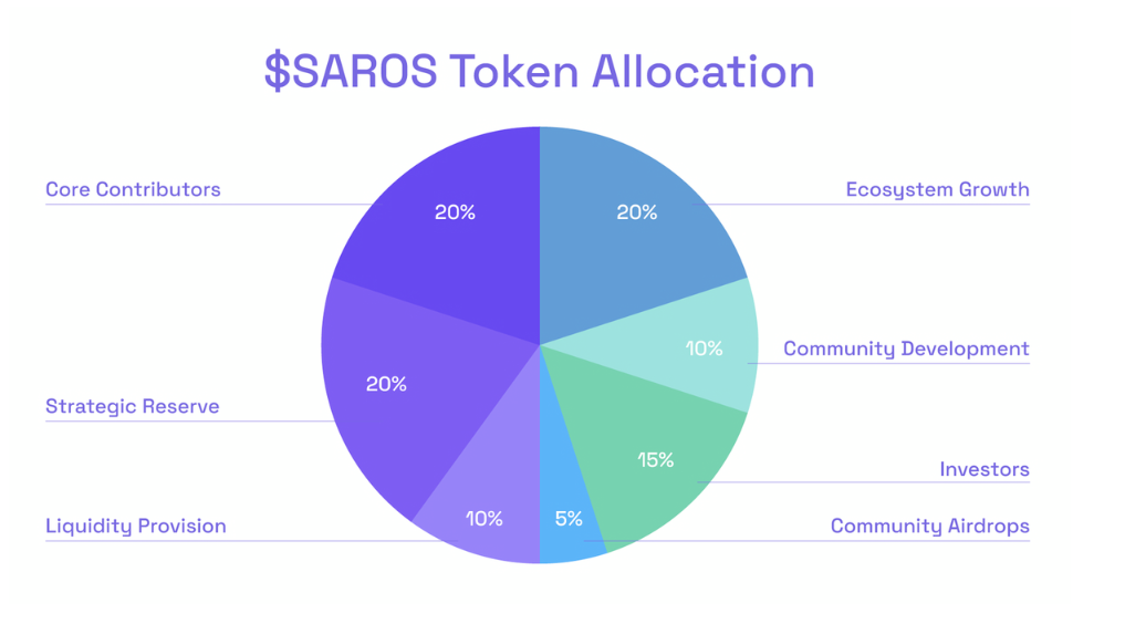- Ecosystem Growth: 20% – 2,000,000,000 SAROS (TGE 25%, 2-year lock, 3-year linear unlock)