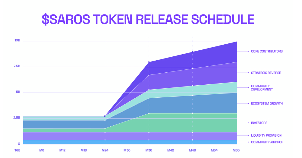 - Core Contributors: 20% -2,000,000,000 SAROS (TGE 0%, 2-year lock, 3-year linear unlock)