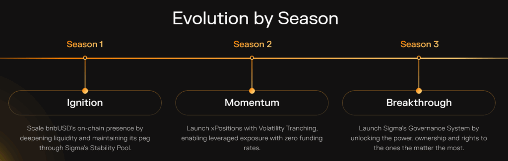 Season 1 – Ignition: On-chain stablecoin (bnbUSD) setup, liquidity deepening. Q4 2025: TGE (Oct 21, Binance Alpha), Points System v2, airdrops, RWA+AI integration.