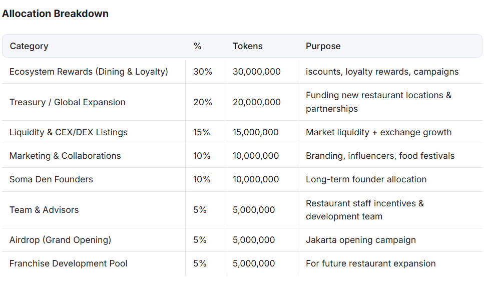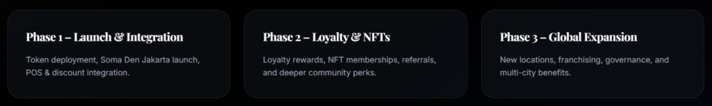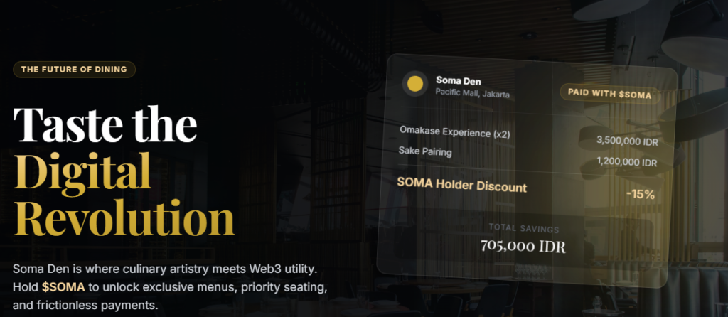 At this stage, Soma Den stands out as a token model built on a revenue-generating restaurant brand rather than a traditional venture-backed Web3 project.
