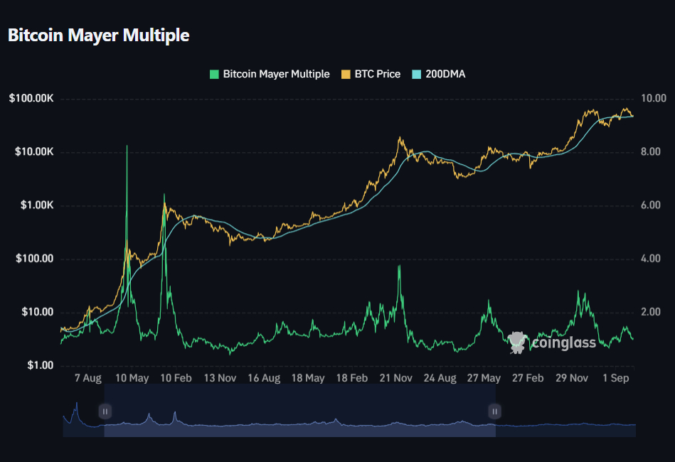 This ratio helps to understand how far the Bitcoin price has moved above or below its long-term trend. For example, if the Mayer Multiple value is 2.0, it means the Bitcoin price is currently twice as high as its 200-day average. This allows investors to quickly assess if the market is in overbought or oversold territory.