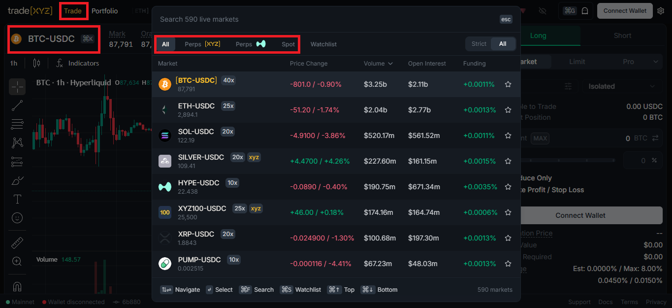Users access markets on Hyperliquid directly through the tradeXYZ interface.