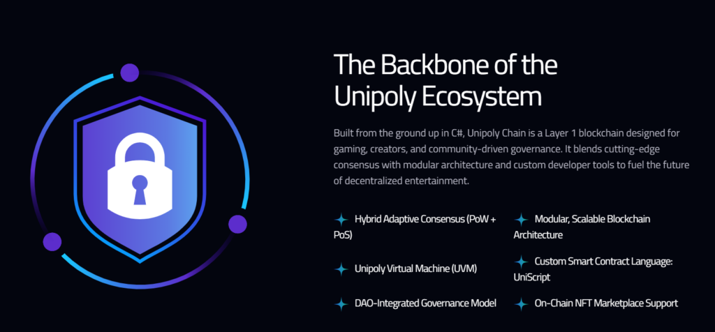 Unipoly operates on its own Layer 1 blockchain, optimized for performance, scalability, and low transaction costs.