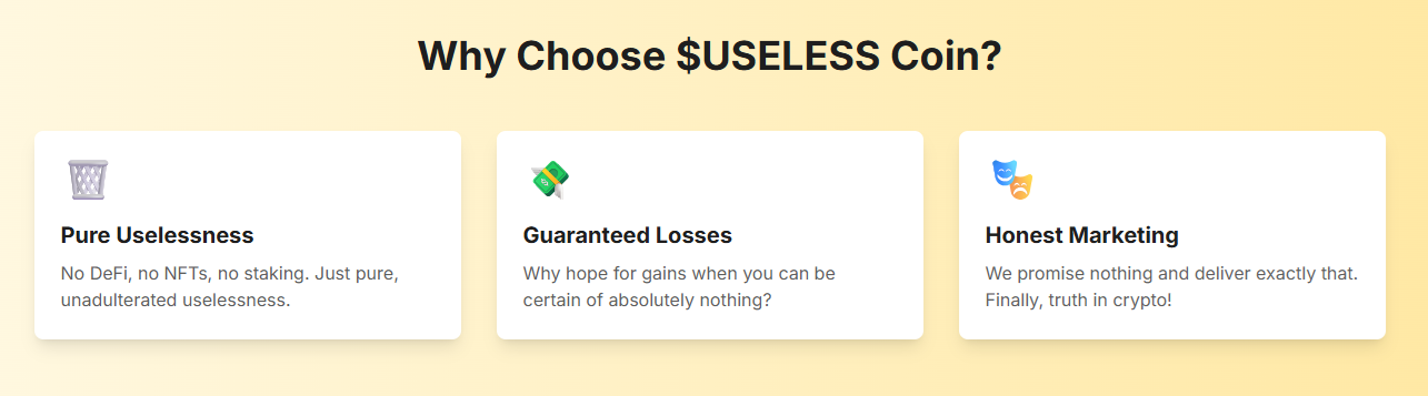 • Self-Aware Meme Identity: By mocking overhyped altcoin projects, USELESS transforms its “useless” branding into a strength, building a community that values transparency and humor.