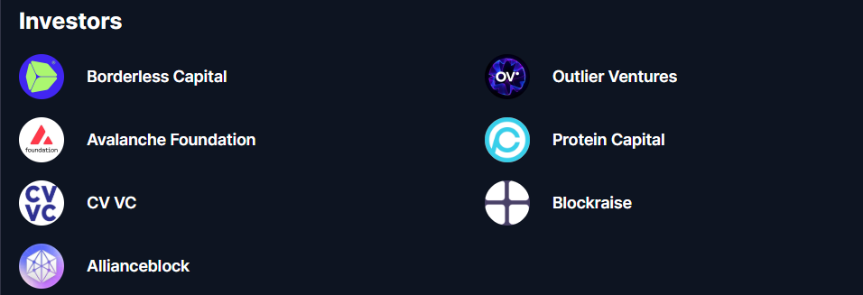 Investors: Outlier Ventures, Avalanche Foundation (AVAX), Borderless Capital. Seed and private rounds total ~$3–4M USD.