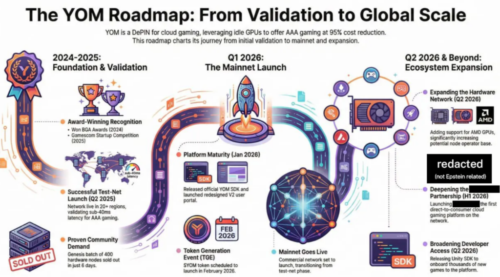 February 2026 – TGE & Token Launch: $YOM officially launched; network’s economic cycle fully operational.