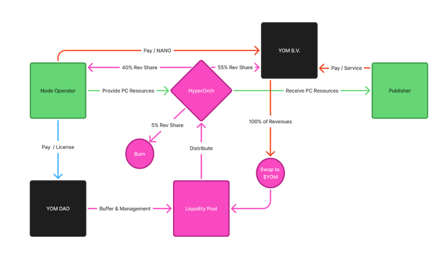 Long-term governance is via YOM DAO. Node operators and community members shape the ecosystem through an XP-based system. Platform updates and incentives are community-driven; malicious actions are automatically penalized.