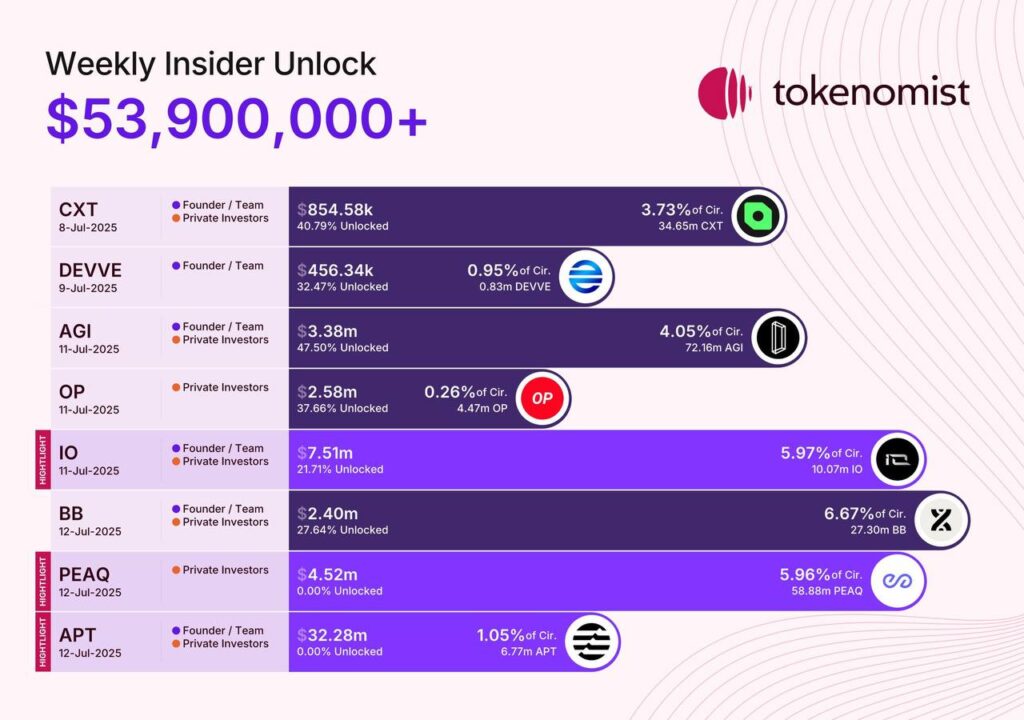 Total Unlocked Value: The total value of tokens unlocked by insiders weekly is over $53,900,000.