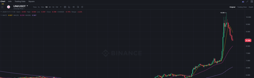 Uniswap (UNI) experienced a significant price surge following the implementation of the fee switch mechanism on November 9, 2025. Within 24 hours, UNI rose by 35.52% to reach $10.30. This increase is directly linked to investor confidence and the protocol’s long-term strategic developments.