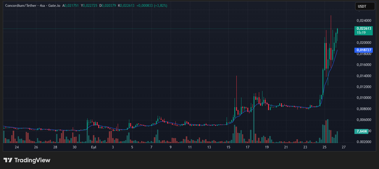 Following Hilbert’s announcement, CCD’s price surged by nearly 30%, reaching the $0.02 level. This rally highlights growing market confidence in Concordium’s long-term vision.