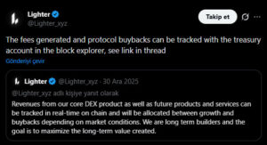The nearly 14% increase in LIT is largely supported by expectations of active token buybacks, transparent treasury data, and strong operational growth. In the highly competitive perpetual trading market, Lighter’s token management strategy could serve as an important reference point not only for LIT but also for other protocols in the DeFi ecosystem.
