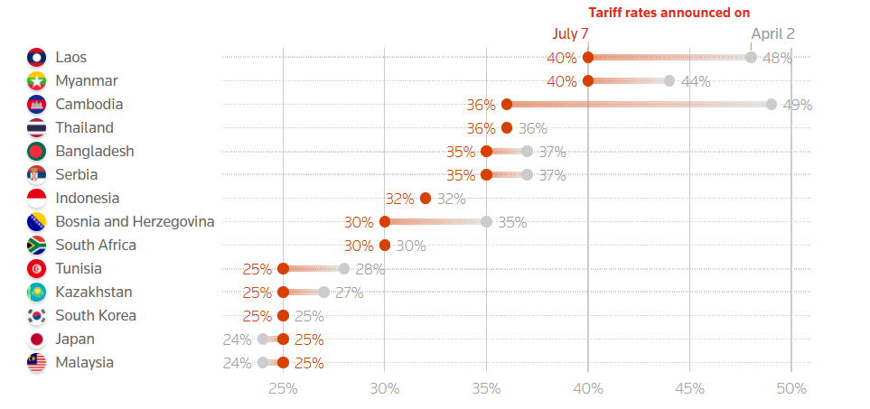 On July 7, U.S. President Donald Trump sent letters announcing new tariffs between 25% and 40% to 14 countries. Initial letters were sent to South Korea and Japan, followed by similar messages to 12 more countries, including Tunisia, Kazakhstan, Serbia, Bosnia, Myanmar, Laos, Bangladesh, Malaysia, Cambodia, Thailand, Indonesia, and South Africa. Trump emphasized concerns over trade deficits and warned of additional tariffs if retaliation occurred.