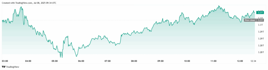 The total market cap dropped by $20 billion in the past day, falling to $3.30 trillion. Since July 3, TOTAL has been trading within a narrow range between $3.35 trillion resistance and $3.27 trillion support. This reflects uncertainty among market participants.