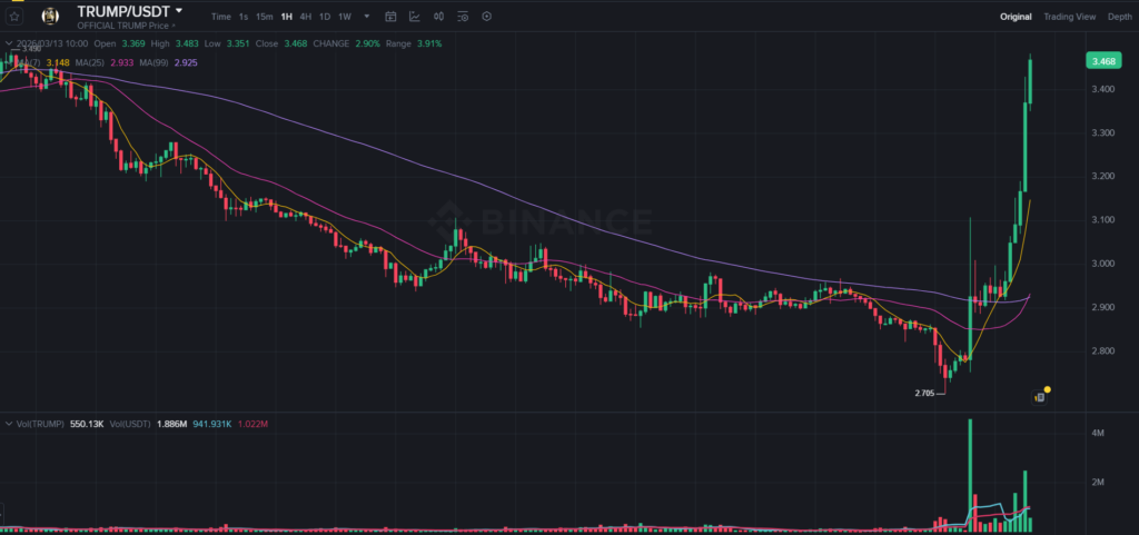 TRUMP token fell approximately 96% from its January 2025 peak of $73, reaching around $2.70. Investors are viewing such event news as a short-term trend reversal signal. Now, the token has surpassed the $3 mark.
