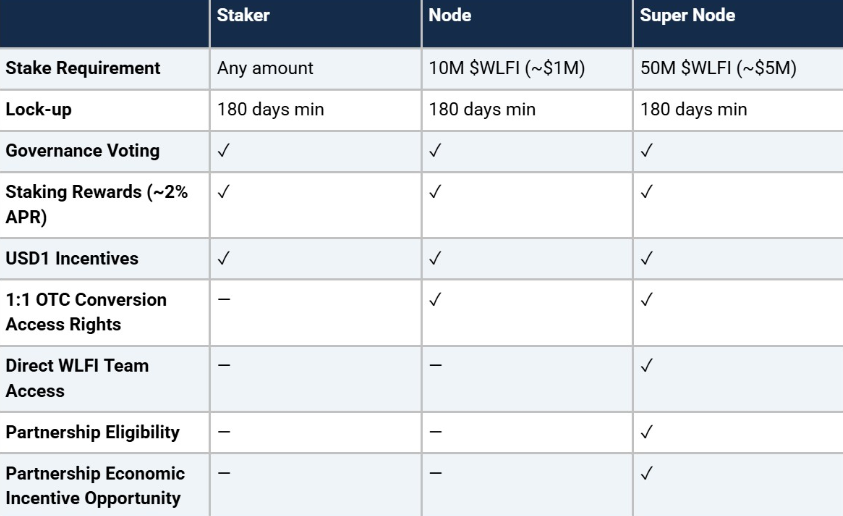 • 50 million WLFI staked: Super node status with direct collaboration opportunities