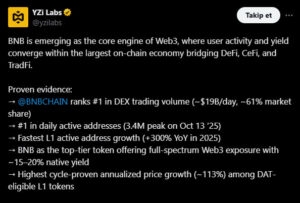 Digital asset investment firm YZi Labs has described BNB as the fundamental driving force of the global Web3 ecosystem in its latest analysis. The firm emphasized that the BNB ecosystem is more than just a cryptocurrency — it stands at the intersection of blockchain, artificial intelligence (AI), and real-world assets (RWA), forming a central pillar of global digital infrastructure.